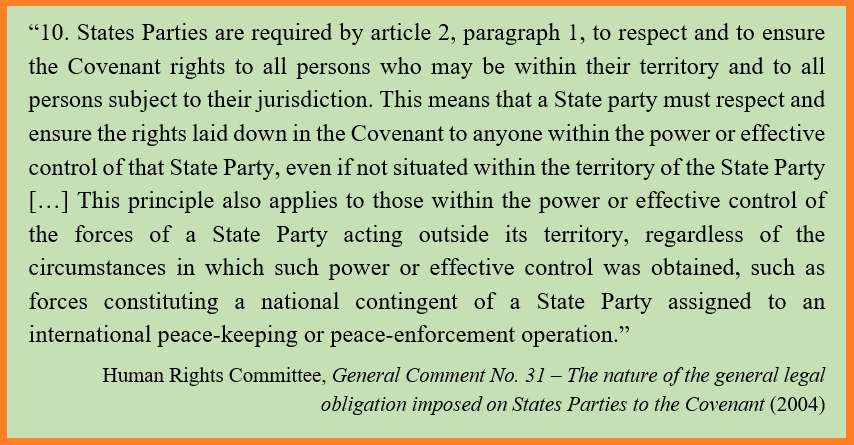 Điều 2 khoản 1 ICCPR quy định các quốc gia tôn trọng và đảm bảo các quyền được Công ước này ghi nhận đối với “mọi người trong phạm vi lãnh thổ và thẩm quyền tài phán của mình”.[3] Ngôn ngữ của ICCPR vì vậy nhấn mạnh giới hạn nghĩa vụ của quốc gia trong phạm vi lãnh thổ và thẩm quyền tài phán của mình.[4] Bởi vì quốc gia có thẩm quyền đối với phạm vi lãnh thổ của mình và vì vậy, đối với mọi người trong lãnh thổ của mình. Tuy nhiên, mối quan hệ giữa công dân – lãnh thổ và thẩm quyền tài phán có được hình thành khác đi. Uỷ ban Nhân quyền vì thế vẫn khẳng định khả năng áp dụng ngoài lãnh thổ trong một số trường hợp, ta sẽ quay lại ở phần sau. Giải thích cho phạm vi áp dụng ngoài lãnh thổ của ICCPR, tại Bình luận Chung 31 (General Comment 31) về bản chất của nghĩa vụ pháp lý về quyền con người, Uỷ ban Nhân quyền nhận định rằng: