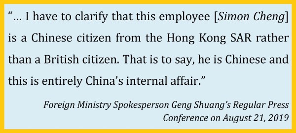 Giải thích của Trung Quốc về việc bắt giữ Simon Cheng – Nguyên tắc không can thiệp vào công việc nội bộ của quốc gia khác – Quyền ưu đãi, miễn trừ lãnh sự của Simon Cheng * Ngày 21.8.2019, Người phát ngôn Bộ Ngoại giao Trung Quốc Geng Shuang xác nhận rằng Simon Cheng... Continue Reading →